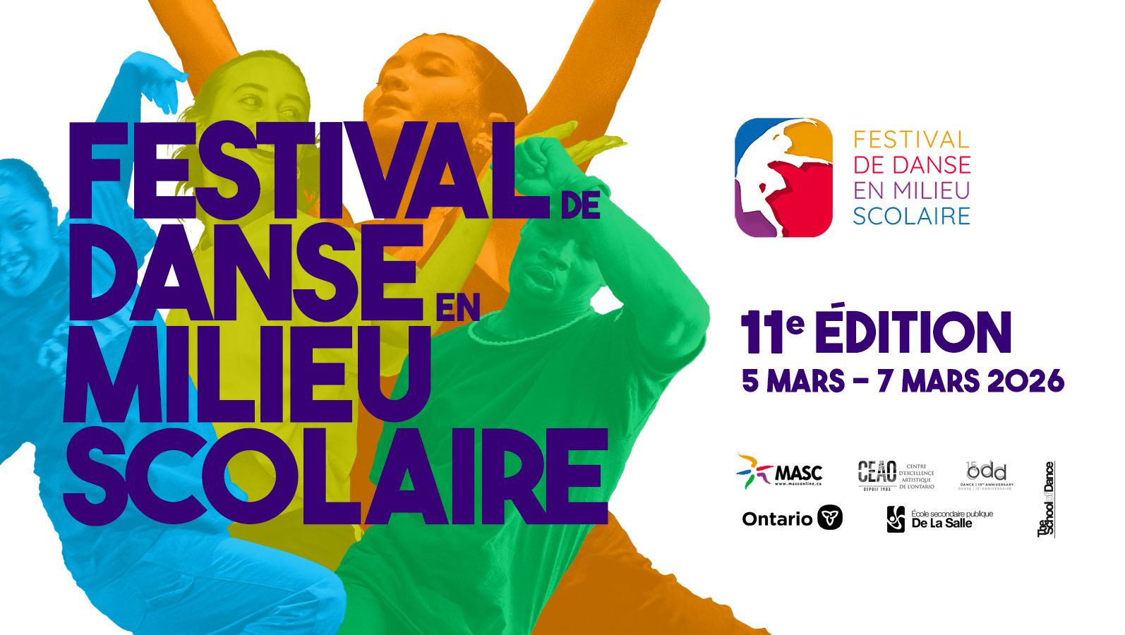 Le Festival de danse en milieu scolaire (FDMS) est un événement organisé par MASC en partenariat avec le Centre d’excellence artistique de l’Ontario, le Centre de danse contemporaine (ODD) et The School of Dance, des chefs de file dans le domaine des arts et de l’éducation artistique.